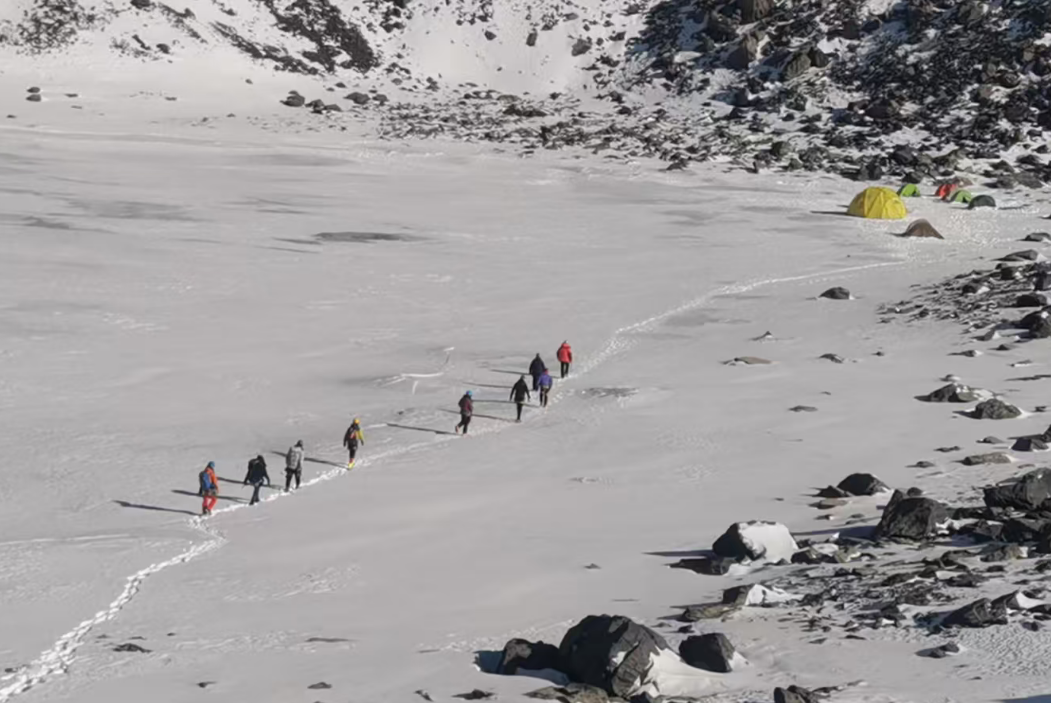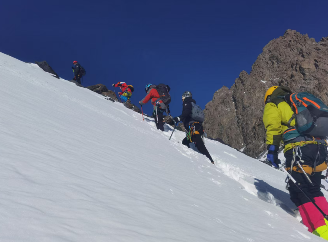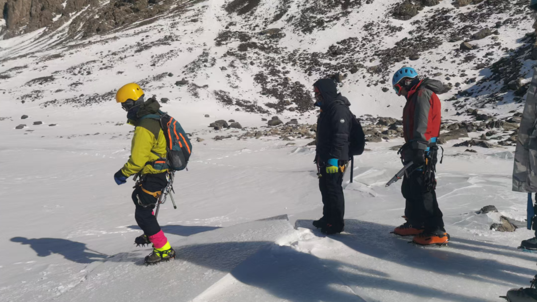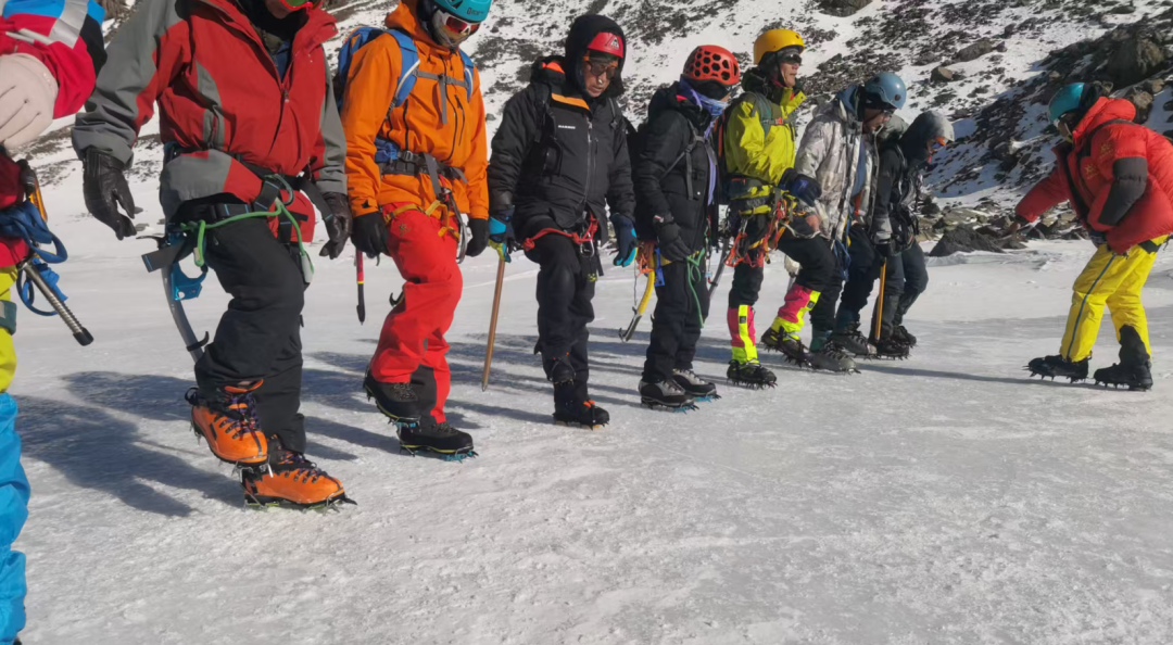 随着培训深入,训练场转移到真正的冰川。学员们脚踩冰爪,手持冰镐,在教练的指导下,反复练习冰坡行走的“法式”、“德式”技术。长长的绳索将每个人的命运紧密相连,结组行进让学员们深刻体会到“团队即生命”的含义。