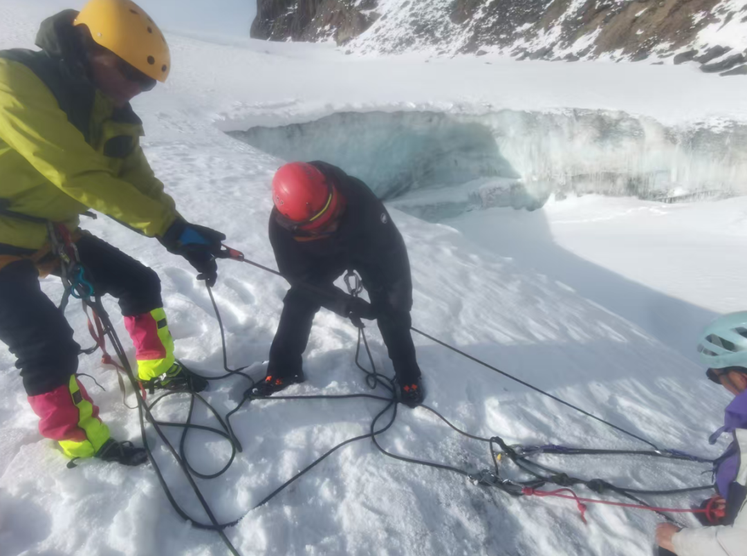 学员们演练了当队友不幸坠入冰裂缝时,如何利用绳索系统迅速、高效地实施救援。